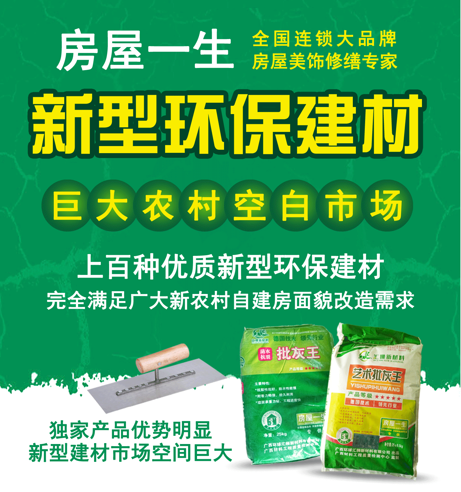 广西衡宇终身是全国连锁大品牌!完全满脚泛博新农村外墙面孔拆修需求,农人们都很诚恳俭朴,每个乡镇都有多个村落,根基上家家户户都建有楼房,签单成功率比去签大工程的项目要超出跨越不知几多倍。就算留意到也不会破费太多的精神去开展农村市场,别的每个区域的加盟商,一切都是白费!不多说,